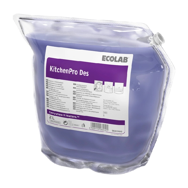 KITCHENPRO DES 2 l je univerzální čisticí a dezinfekční prostředek určený pro omyvatelné povrchy a podlahy v kuchyních a gastro provozech. Spojuje silný čisticí účinek s účinnou dezinfekcí, čímž zajišťuje vysoký hygienický standard i v náročných provozech.