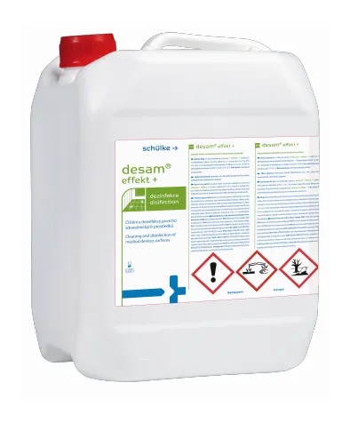 Desam® Effekt + je vysoce účinný koncentrovaný dezinfekční přípravek určený pro ruční čištění a dezinfekci povrchů zdravotnických prostředků a dalších ploch ve zdravotnických zařízeních i v oblasti komunální hygieny. Kombinace účinných látek na bázi kvartérních amoniových solí (KAS), aminů a fenoxyetanolu zajišťuje široké spektrum mikrobiologické účinnosti při zachování dobré materiálové kompatibility.