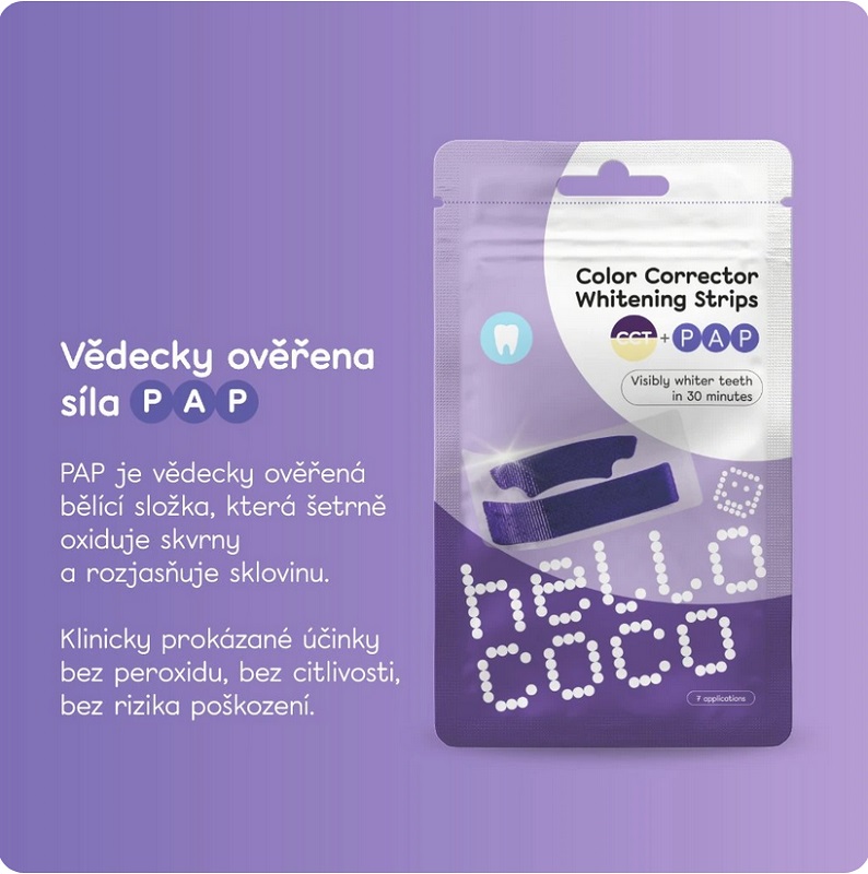 Objevte novou generaci bělení zubů s bělícími pásky s technologií PAP a barevnou korekcí, které přinášejí okamžitý optický efekt i skutečné, viditelné bělení – bez kompromisů.