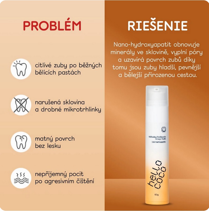 Zubní sklovina je z až 97 % tvořena hydroxyapatitem. Používáním n-Ha tedy zuby nejen chráníte, ale i přirozeně posilujete zevnitř. Výsledkem je bělejší úsměv bez citlivosti.