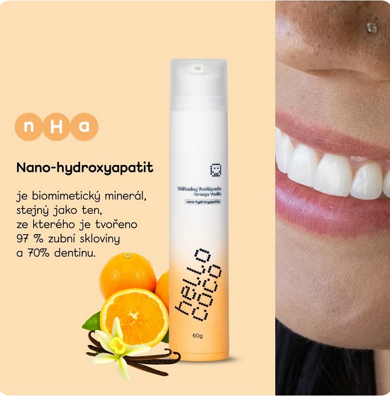 Základem složení je nano-hydroxyapatit (n-Ha) – minerál, který tvoří přirozenou součást zubní skloviny. Pomáhá remineralizovat oslabenou sklovinu, vyhlazuje povrch zubů a tím podporuje jejich přirozenou bělost. Zuby jsou díky tomu silnější, hladší a méně citlivé.
