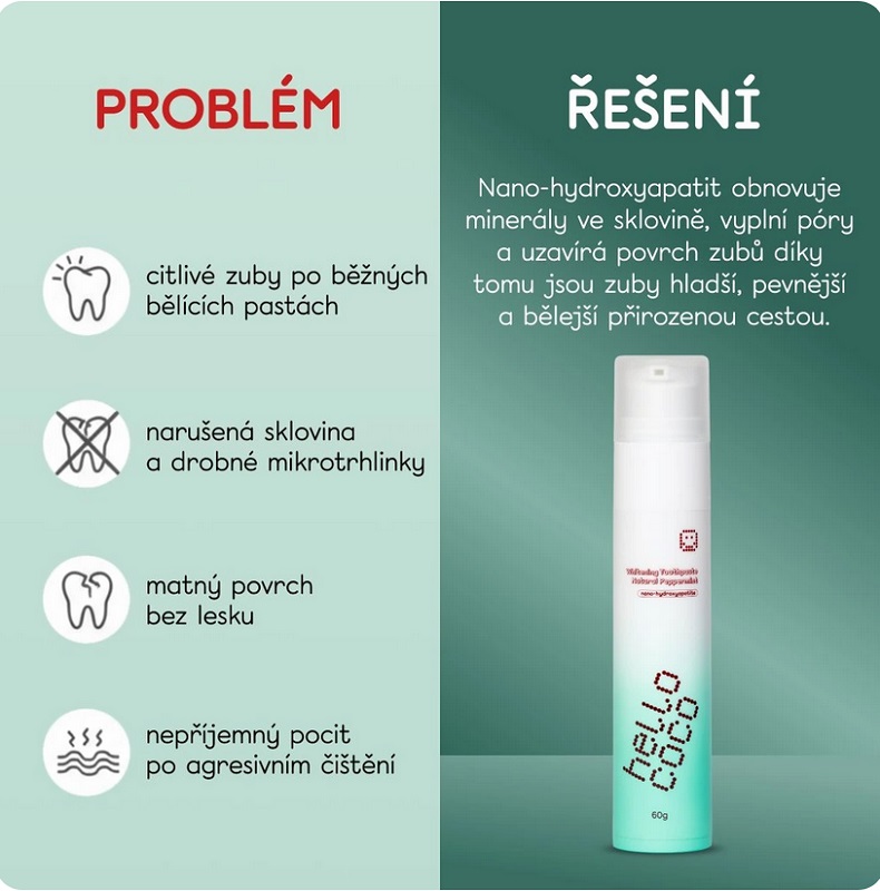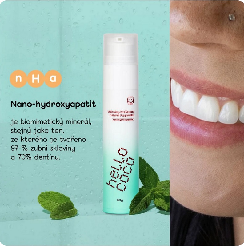 Hello Coco zubní pasta jemně, ale účinně rozjasňuje a bělí zuby díky přírodním složkám a nano-hydroxyapatitu. Pomáhá obnovovat zubní sklovinu, chrání před plakem a zanechává dlouhotrvající svěží dech. Ideální i pro citlivé zuby.