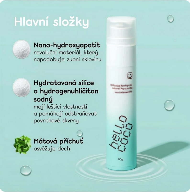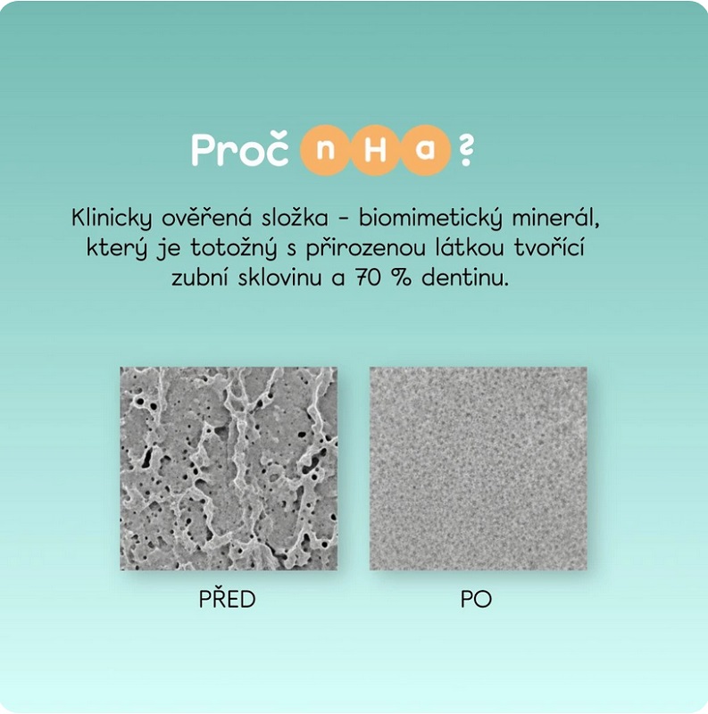 Základem složení je nano-hydroxyapatit (n-Ha) – minerál, který tvoří přirozenou součást zubní skloviny. Pomáhá remineralizovat oslabenou sklovinu, vyhlazuje povrch zubů a tím podporuje jejich přirozenou bělost. Zuby jsou díky tomu silnější, hladší a méně citlivé.