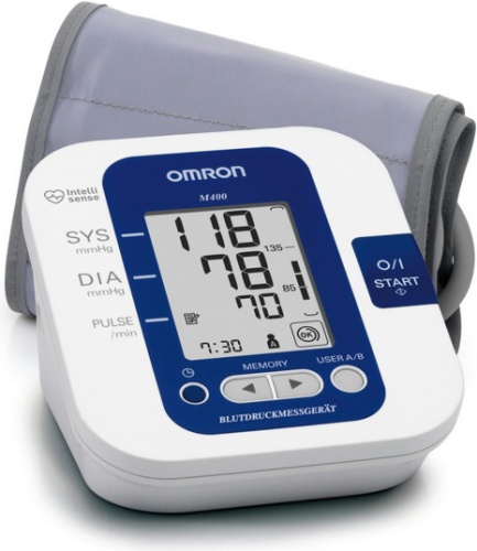 Omron M400 je vhodný pro měření krevního tlaku a pulsu až dvou osob. Má dělenou paměť, pro každou osobu až na 60 záznamů měření včetně data a času. Každý ocení jeho velmi snadné použití. Předností tohoto tlakoměru je velký, přehledný a snadno čitelný displej. Hodnoty jsou měřeny pomocí manžety nasazené na paži. Přístroj nafoukne manžetu jen tolik, kolik je potřeba a tak je měření navíc příjemné a rychlé) a měkkou