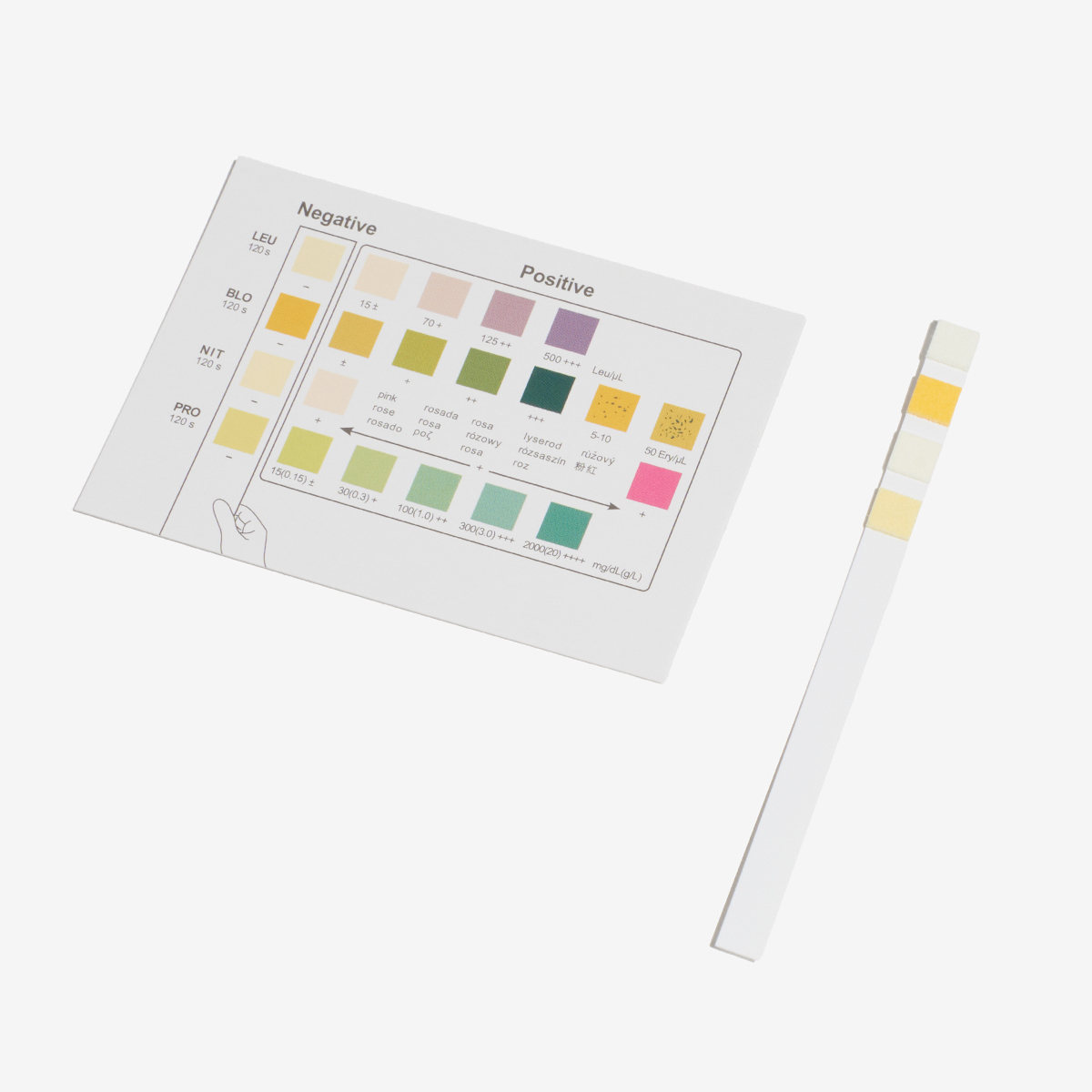 Testovací proužek funguje na principu barevné změny indikátorů, které srovnáte s přiloženou referenční tabulkou.