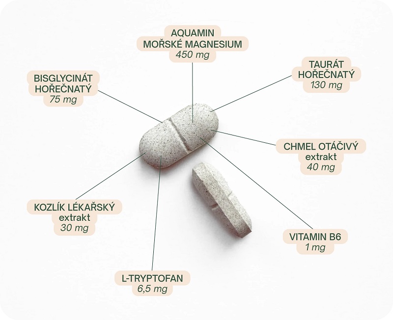 V tabletě naleznete hořčík (magnesium aquamin + bisglycinát), kozlík lékařský, vitamin B6, chmel otáčivý, L-Tryptofan